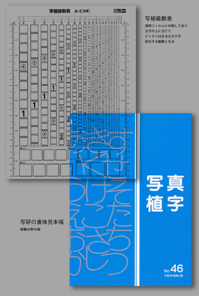 佐々木店長が、デザイナーとして広告代理店に入社した頃は、デザイナー職専門のクリエーティブ研修が終わると、終了祝いにデザイナー用グッズ(?)が配布されました。まだアナログ全盛の時代なので、配給されるのは、烏口、直線を引くための補助ガラス棒と溝の入った定規、コンパスとディバイダー、それに版下製作用のロットリングペンセットなどです。中でも必須なのが、書体メーカーである(株)写研の級数表と書体見本帳でした(画像①)。コピーライターが書いたコピー文字数(もちろん何文字あるか数えます)が、レイアウトしたコピースペースに入るかどうか調べるにはこの2つはなくてはならないグッズでした。