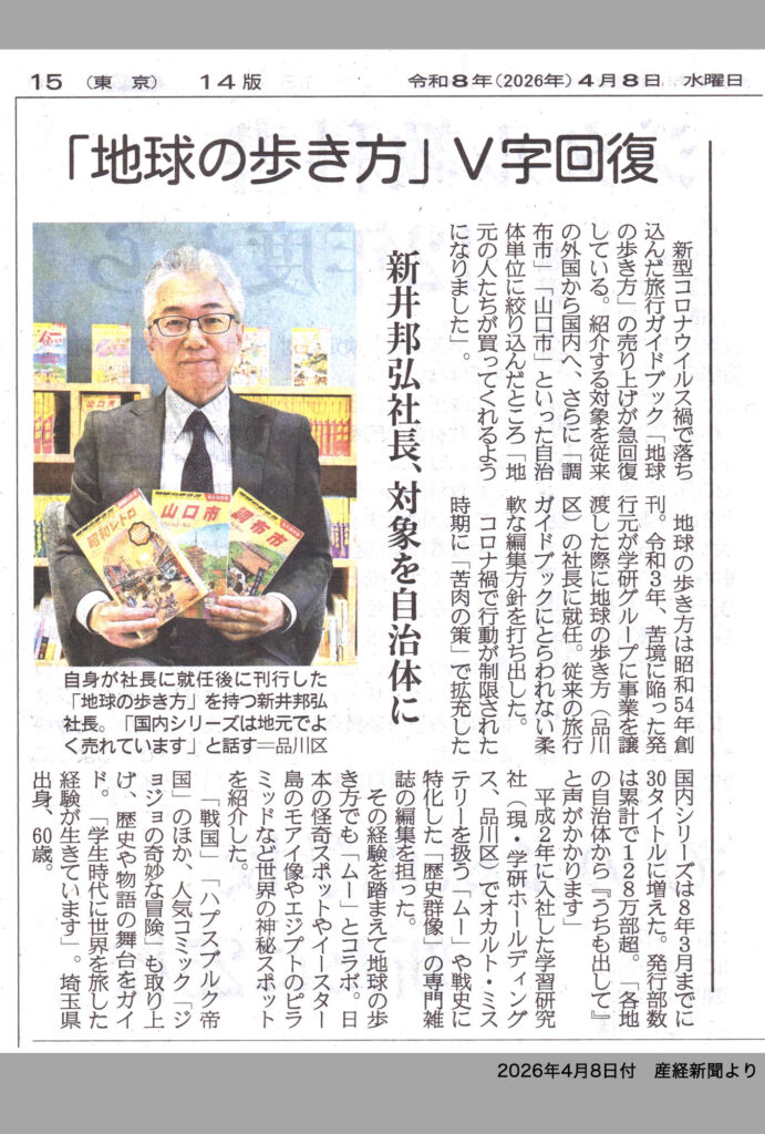 ある日の産経新聞に、学研の旅行ガイドブック「地球の歩き方」の売り上げがV字回復している、という記事が載っていました(画像①)。デジタルガイドの台頭に加えて、コロナ禍で落ち込んだ売り上げが、自治体レベルの細かいガイド記事に切り替えたところ、そのコアさが地元民に受けたようです。(随分前に「タモリ倶楽部」でも放送していましたね。)